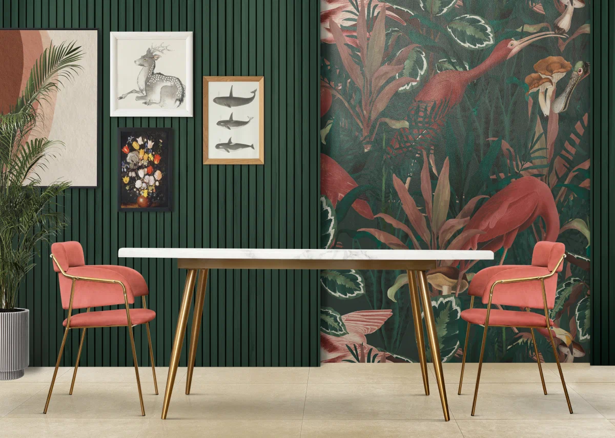 ຄໍເລັກຊັນຫ້ອງຄົວທີ່ຜະສົມຜະສານລະຫວ່າງຄວາມຄລາສສິກ ແລະ ທັນສະໄໝ. ໂຕະ, ເກົ້າອີ້, ແລະ ຕູ້ທີ່ອອກແບບດ້ວຍສີສັນສົດໃສ ເໝາະສຳລັບຄົນຮັກໃນການປຸງແຕ່ງອາຫານ.